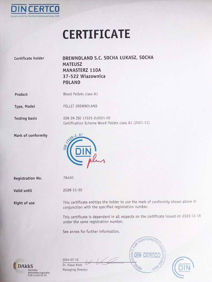 Pellet Drewnoland spełnia wymagania jakościowe określone w obowiązujących przepisach oraz normach dla biomasy drzewnej. Certyfikat DINplus potwierdza, że produkt odpowiada rygorystycznym standardom w zakresie produkcji i jakości paliwa. Dodatkowo pellet jest zgodny z wymaganiami określonymi w rozporządzeniu Ministra Klimatu i Środowiska dotyczącym jakości biomasy, co oznacza, że może być bezpiecznie stosowany w nowoczesnych instalacjach grzewczych.